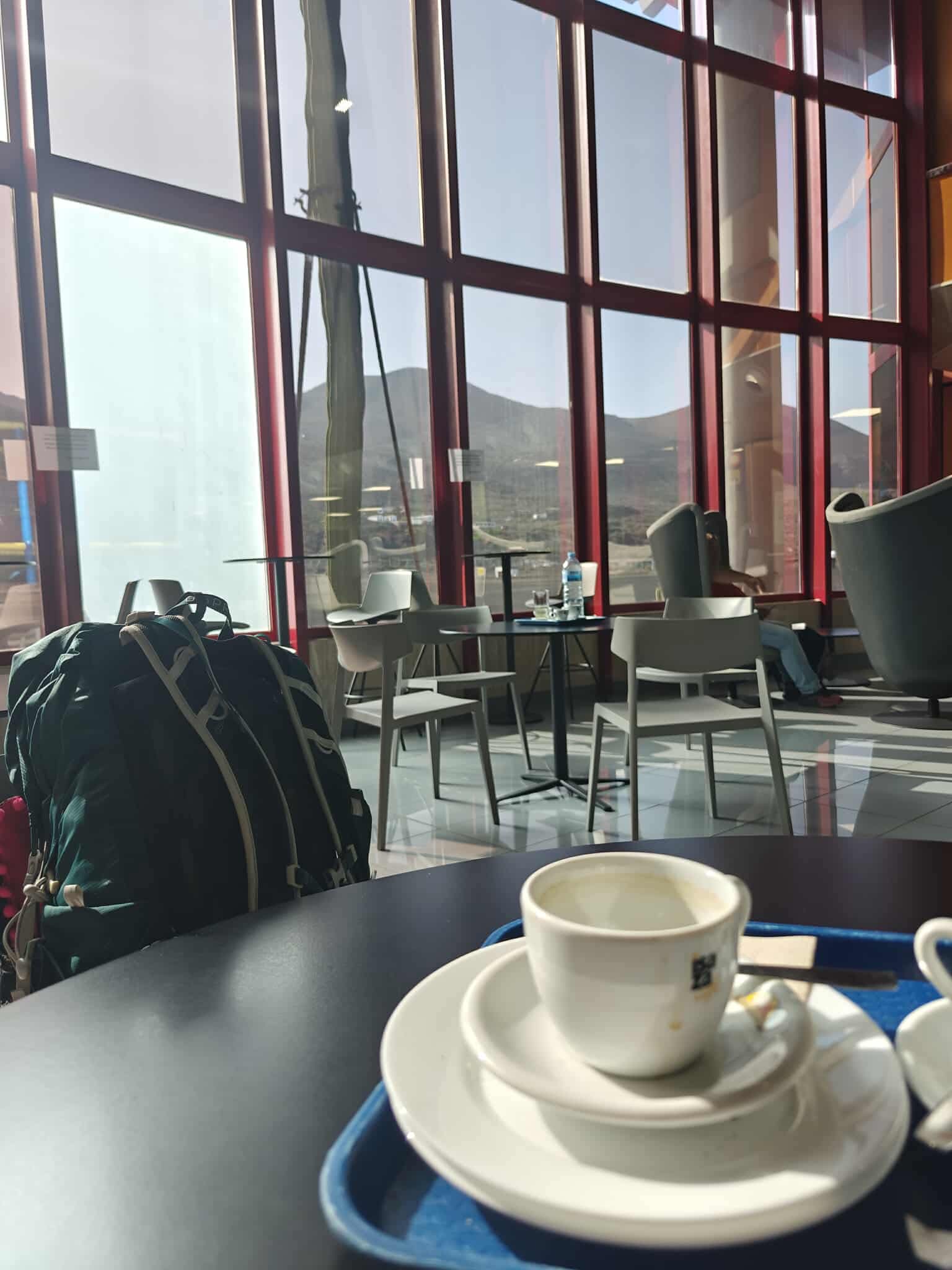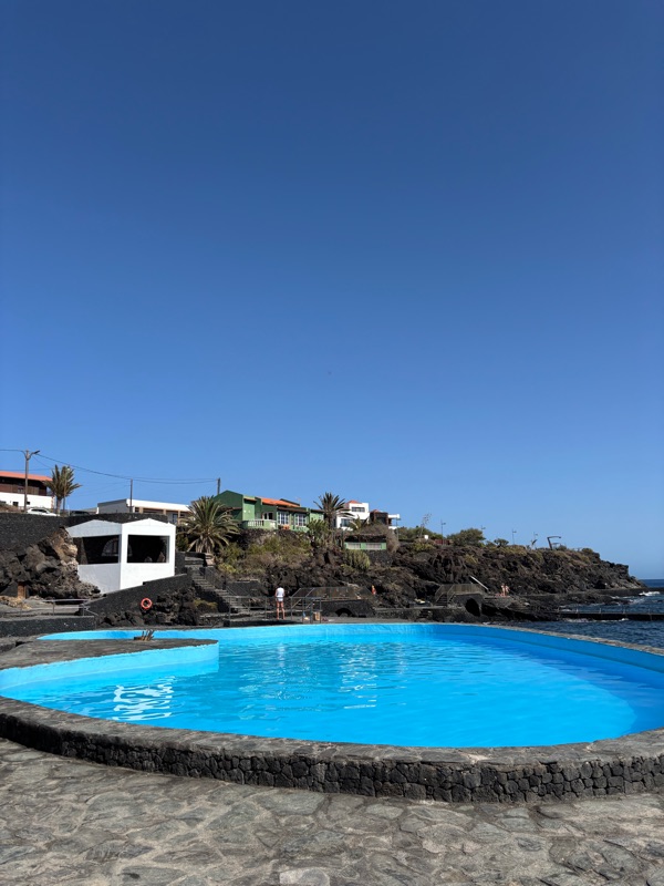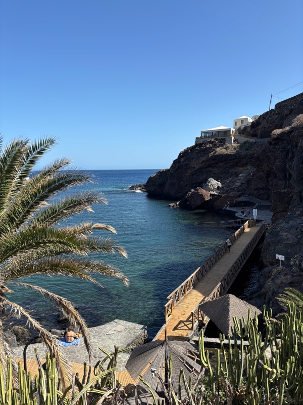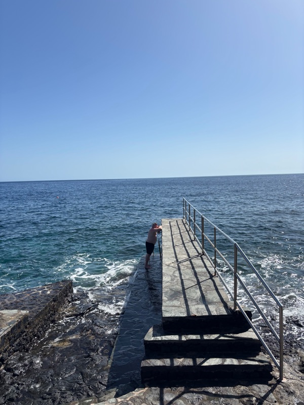 En av badbryggorna i La Caleta. Vid 15 tiden åkte vi till flygplatsen för att lämna hyrbilen och checka in bagaget. Det är en pytteliten flygplats och vi hade väldigt gott om tid. Vi fikade och förberedde oss på flygresan.