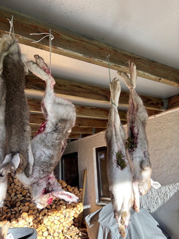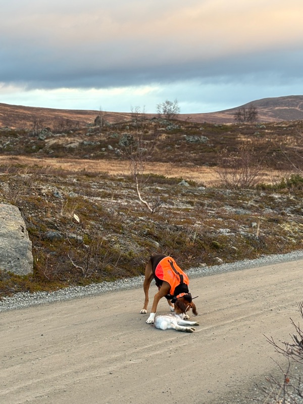 Bellman kommer efter och hugger tag i haren. Jag får kopla honom och binda fast honom i en fjällbjörk. Det uppskattas inte. Men när jag tömmer haren får han iallafall hjärtat och är nöjd. Jag packar haren i ryggsäcken när den är klar för transport vidare.