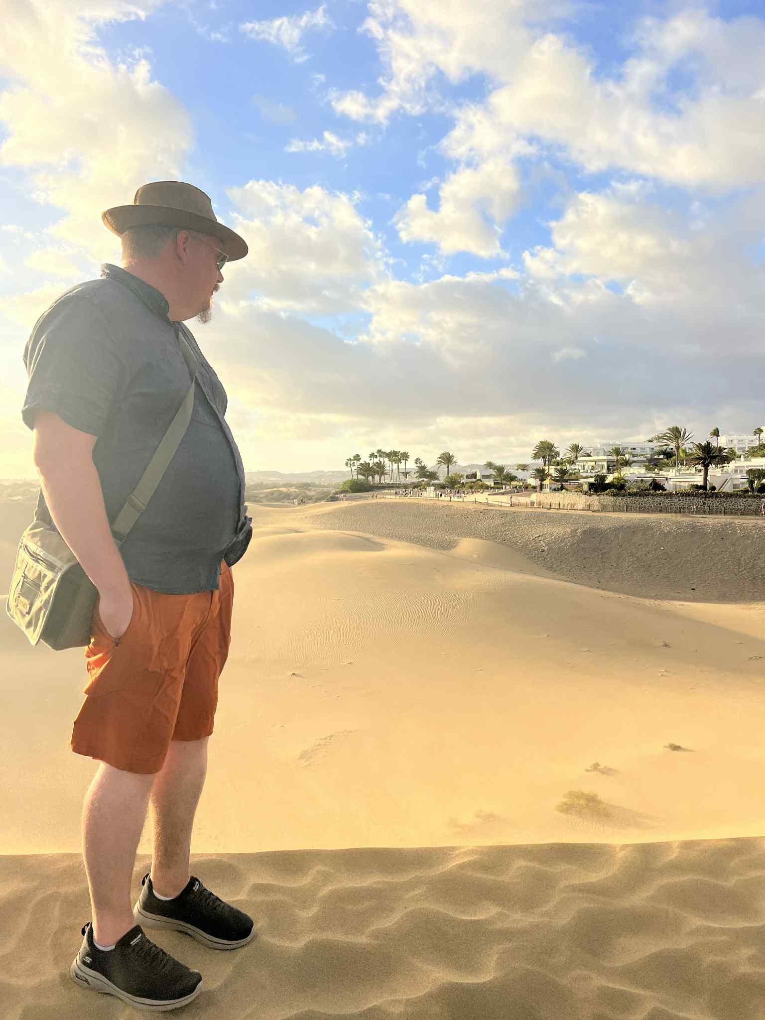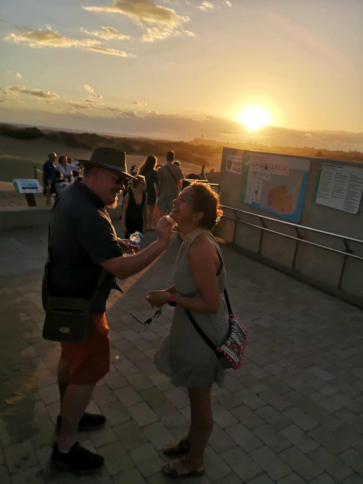 På eftermiddagen åkte vi till Maspalomas för att få med oss de sista solstrålarna över sanddynerna. Polisen började vissla och veva i armarna när vi och många andra hade gått ut på sanddynerna. Det är tydligen nya restriktioner för att skydda faunan här.
