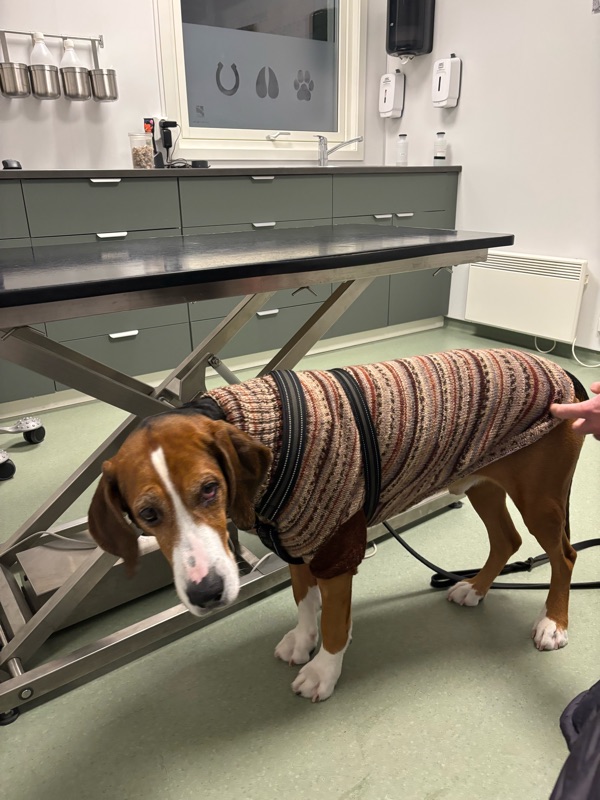 En gång i månaden är det besök hos veterinären för ketaminspruta. Vi fick också besked om att använda täcke o h kläder på Bellman. Eftersom han har värk i kroppen, får vi försöka hålla honlm varm. Eli stickade en ny tröja till honom. Den har vi använt flitigt.