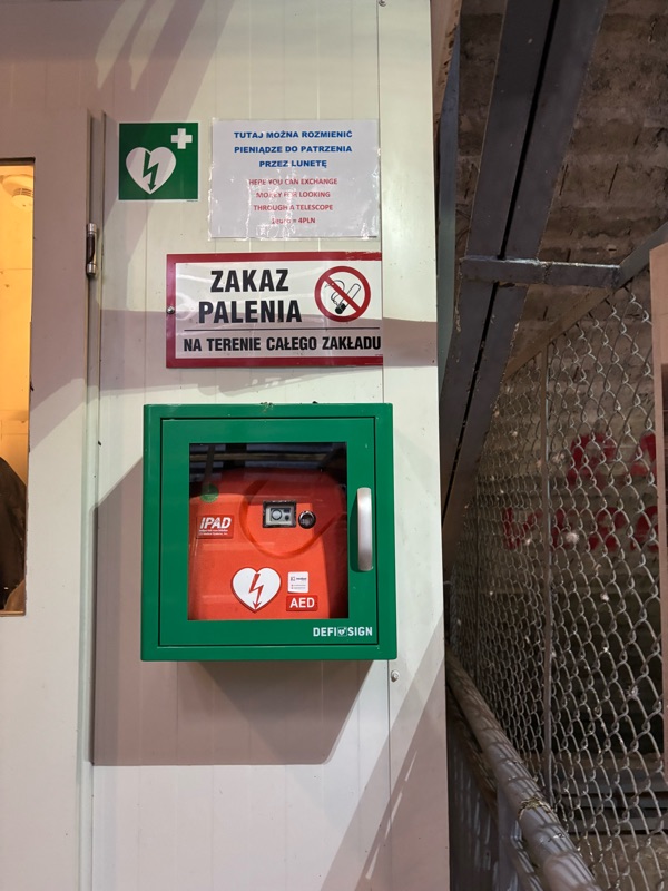 På toppen hängde hjärtstartaren och det satt en person och passade på. Undrar om de hände olyckor här innan de hängde upp hjärtstararen. Trappan var så smal, du hade aldrig kommit upp med en bår dit.