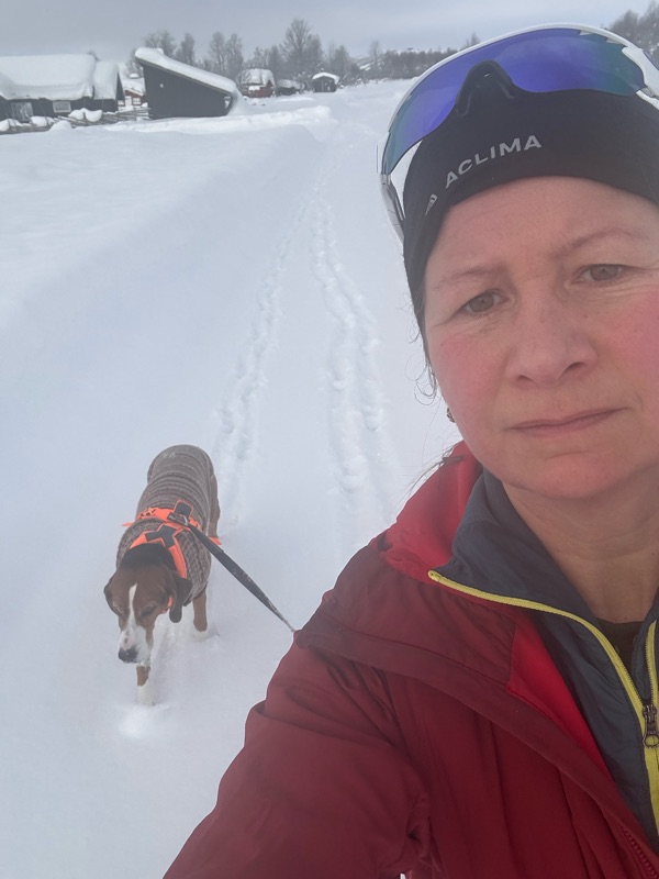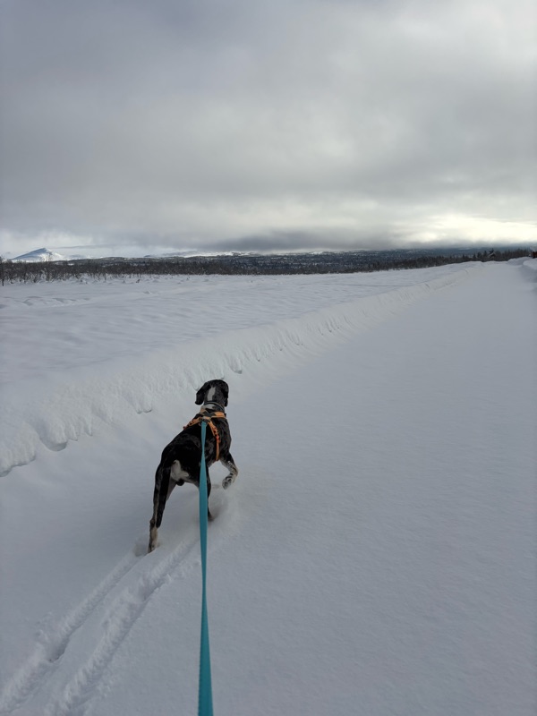 I dag är det måndag och jag har ledigt. I går var jag ute med Bill och åkte fjällskidor. Vi åkte rundan runt Østerli, 18km. I dag hsr vi gått långpromenad, lite svårt me båda samtidgt. Men det får gå. En drar för fullt fram och en är ankare bakom.