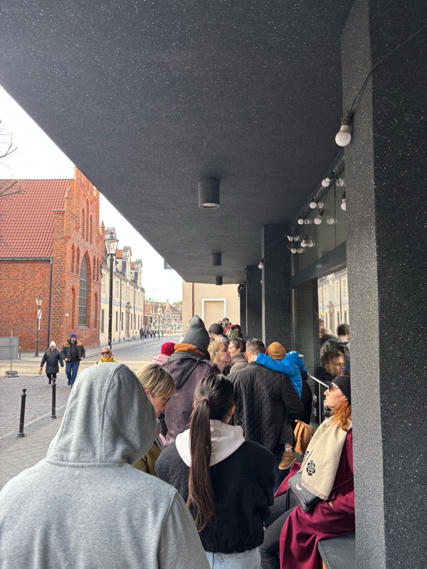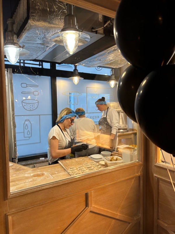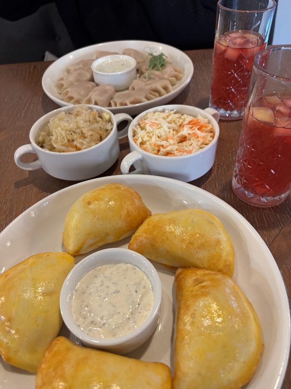 Vi frågade i receptionen var de bästa pirogerna fanns. Receptionisten sa att de fanns på Mandu pierogi. Det låg innom promenadavstånd så vi gick dit. Där blev vi överraskade av att det var en lång kö. Vi fick stå i kö en liten timme innan vi fick bord. Men det var så värt det: Godaste pirogererna jag ätit. Celina guidade mig igenom menyn. Det var både kokta och bakade. De kokta är som dumplings. Vi drack kompott till. Kompott är som en slags blandsaft.